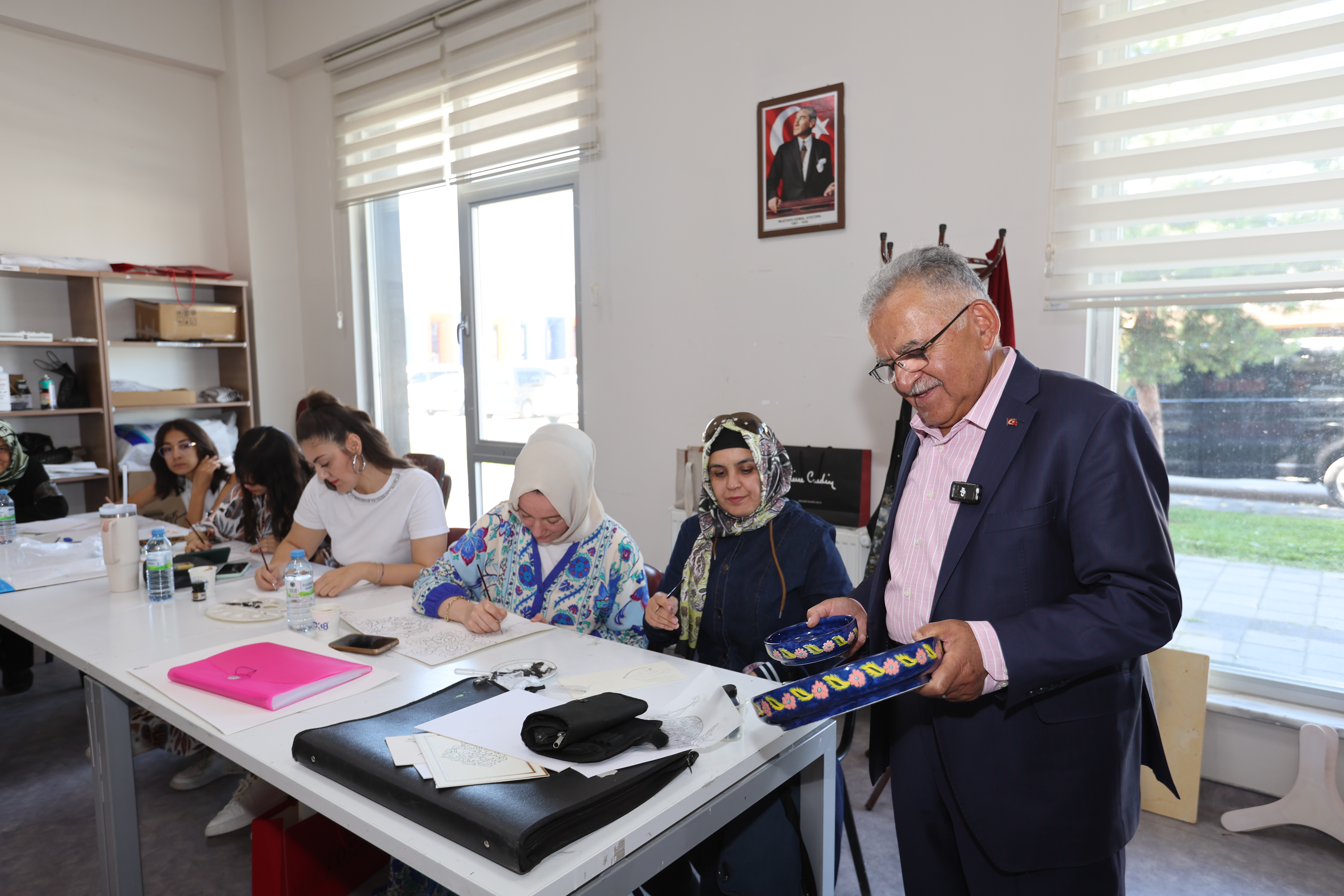 Kayseri Büyükşehir Belediye Başkanı Dr. Memduh Büyükkılıç, KAYMEK’in el becerilerine ve mutfak alanına yönelik kurslarında kursiyerler ile bir araya gelerek, sohbet etti. Sanatsal faaliyetlere yönelik gerçekleşen sohbette Büyükkılıç, ortaya konulan çalışma ve eserler hakkında bilgiler alarak yapılan faaliyetleri inceledi. Başkan Büyükkılıç, ziyaretin sonunda günün anısına kursiyerler ve personel ile hatıra fotoğrafı çekindi.