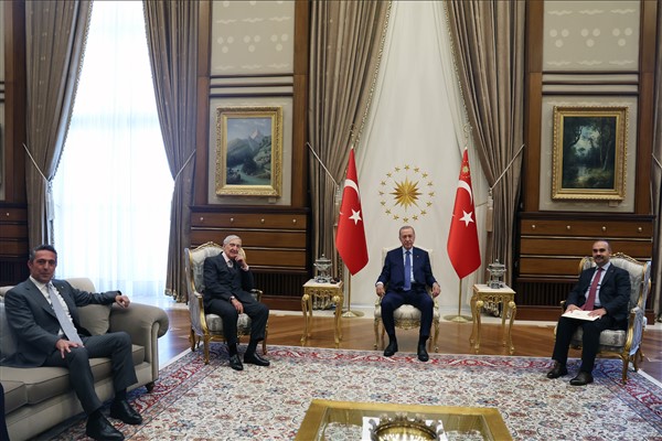 Cumhurbaşkanı Recep Tayyip Erdoğan, Sanayi ve Teknoloji Bakanı Mehmet Fatih Kacır ile iş insanları Rahmi Koç ve Ali Koç'u Cumhurbaşkanlığı Külliyesi'nde kabul etti.