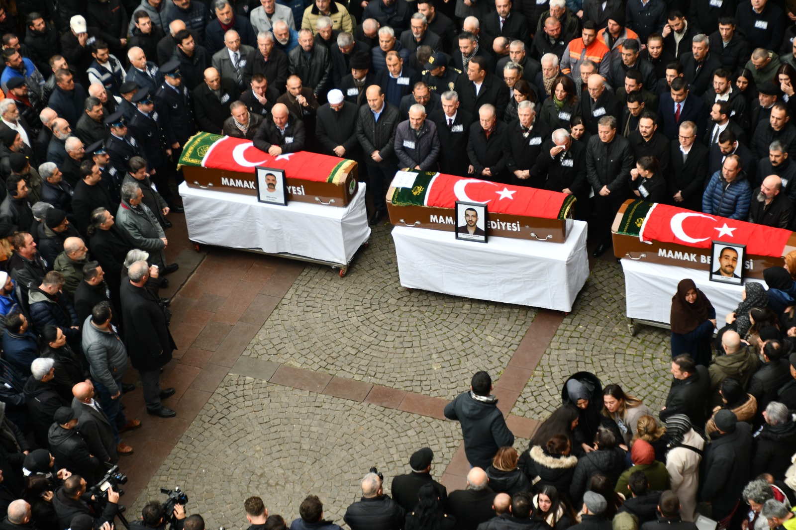 Dün sabah saatlerinde İmrahor bölgesinde freni patlayan kamyonun üzerlerine devrilmesi sonucu hayatını kaybeden Mamak Belediyesi personelleri Ese Güler (53), Mustafa Ali Köksal (38) ve Emre Soylu (39), Mamak Belediye binası önünde düzenlenen törenle son yolculuğuna uğurlandı.