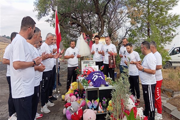 Dernek üyeleri, 20 kişilik bir grupla Narin’in mezarını ziyaret ederek, Samsunspor’un kadın taraftarlara özel hazırlattığı bir formayı da mezara bırakarak dua etti. Heyet ziyaret sırasında, yanlarında getirdikleri “Çocuklar Narindir” yazılı pankartı açtı.