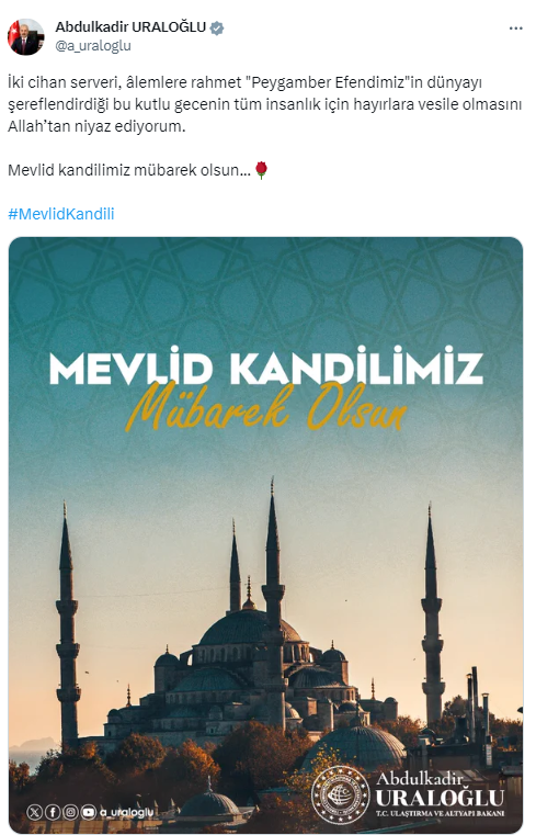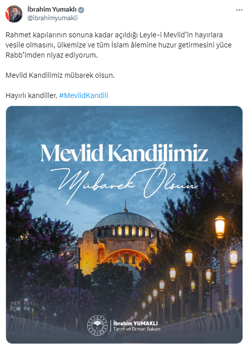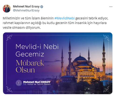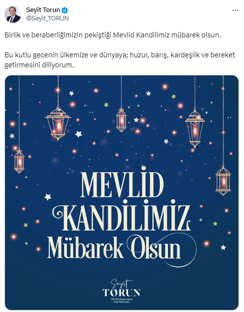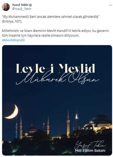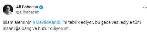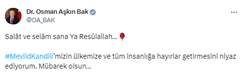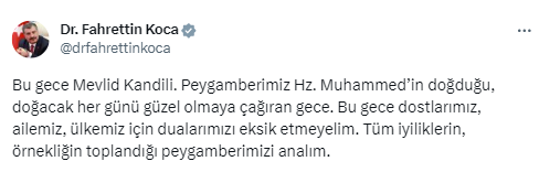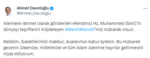 "Milletimizin ve tüm İslam aleminin Mevlidi Nebi gecesini tebrik ediyor, rahmet kapılarının açıldığı bu kutlu gecenin tüm insanlık için hayırlara vesile olmasını diliyorum."