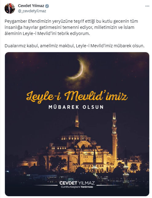 Cumhurbaşkanı Yardımcısı Cevdet Yılmaz, sosyal medya hesabından yayımladığı mesajda "Peygamber Efendimizin yeryüzüne teşrif ettiği bu kutlu gecenin tüm insanlığa hayırlar getirmesini temenni ediyor, milletimizin ve İslam aleminin Leyle-i Mevlid’ini tebrik ediyorum. Dualarımız kabul, amelimiz makbul, Leyle-i Mevlidimiz mübarek olsun." ifadelerine verdi.