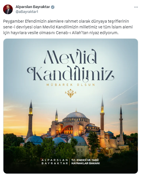 Enerji ve Tabii Kaynaklar Bakanı Alparslan Bayraktar, sosyal medya hesabından yayımladığı mesajda "Peygamber Efendimizin alemlere rahmet olarak dünyaya teşriflerinin sene-i devriyesi olan Mevlid Kandilimizin milletimiz ve tüm İslam alemi için hayırlara vesile olmasını Cenab-ı Allah’tan niyaz ediyorum." ifadesini kullandı.