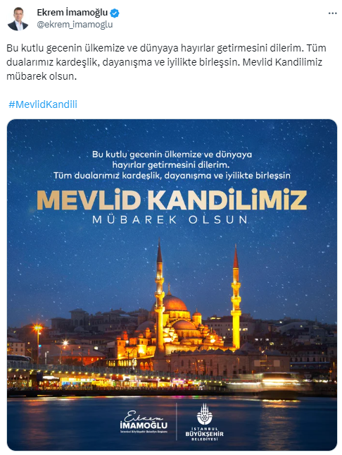"Birlik ve beraberliğimizin pekiştiği Mevlid Kandilimiz mübarek olsun. Bu kutlu gecenin ülkemize ve dünyaya; huzur, barış, kardeşlik ve bereket getirmesini diliyorum."