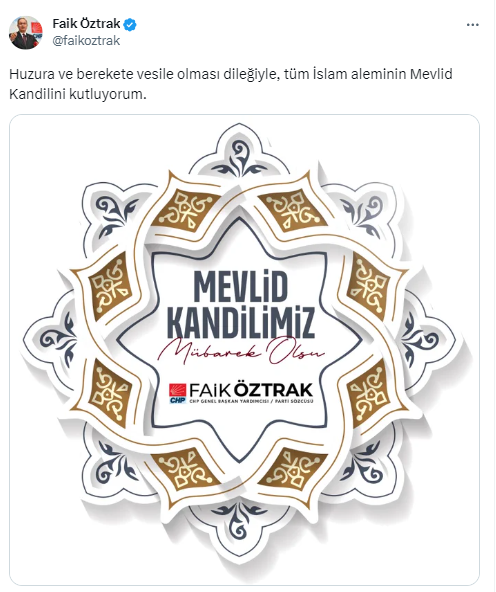 CHP Sözcüsü Faik Öztrak, mesajında "Huzura ve berekete vesile olması dileğiyle, tüm İslam aleminin Mevlid Kandilini kutluyorum." ifadesini kullandı.