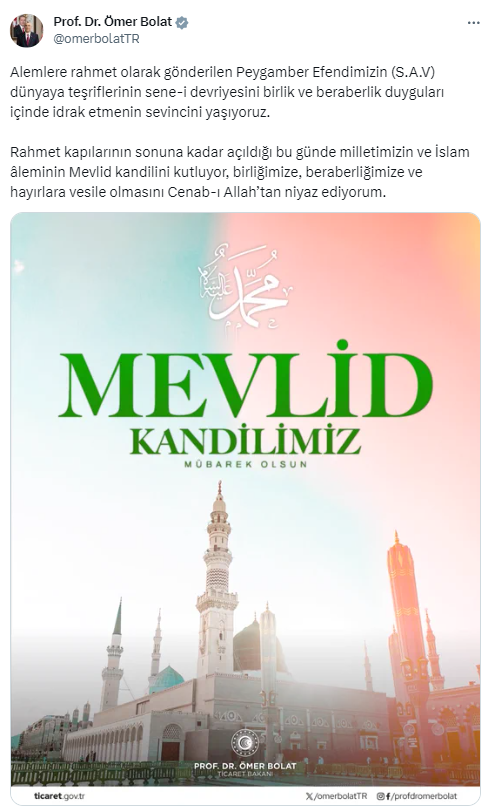 Ticaret Bakanı Ömer Bolat, sosyal medya hesabından yayımladığı mesajda “Alemlere rahmet olarak gönderilen Peygamber Efendimizin (S.A.V) dünyaya teşriflerinin sene-i devriyesini birlik ve beraberlik duyguları içinde idrak etmenin sevincini yaşıyoruz. Rahmet kapılarının sonuna kadar açıldığı bu günde milletimizin ve İslam aleminin Mevlid kandilini kutluyor, birliğimize, beraberliğimize ve hayırlara vesile olmasını Cenab-ı Allah’tan niyaz ediyorum.” ifadelerini kullandı.