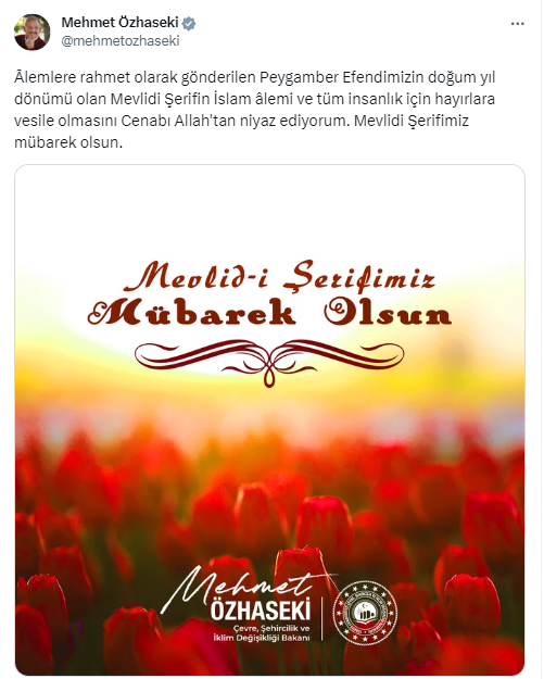 Çevre, Şehircilik ve İklim Değişikliği Bakanı Mehmet Özhaseki, sosyal medya hesabından yayımladığı mesajda "Alemlere rahmet olarak gönderilen Peygamber Efendimizin doğum yıl dönümü olan Mevlidi Şerifin İslam alemi ve tüm insanlık için hayırlara vesile olmasını Cenabı Allah'tan niyaz ediyorum. Mevlidi Şerifimiz mübarek olsun." ifadelerine yer verdi.