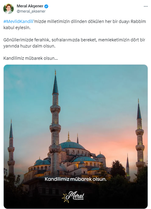 “Bu gece Mevlid Kandili. Peygamberimiz Hz. Muhammed’in doğduğu, doğacak her günü güzel olmaya çağıran gece. Bu gece dostlarımız, ailemiz, ülkemiz için dualarımızı eksik etmeyelim. Tüm iyiliklerin, örnekliğin toplandığı peygamberimizi analım.”
