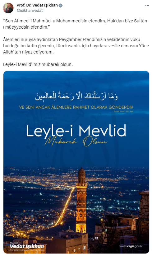 Çalışma ve Sosyal Güvenlik Bakanı Vedat Işıkhan, mesajında "“Sen Ahmed-i Mahmud-u Muhammed'sin efendim, Hak'dan bize Sultan-ı müeyyedsin efendim.” Alemleri nuruyla aydınlatan Peygamber Efendimizin veladetinin vuku bulduğu bu kutlu gecenin, tüm insanlık için hayırlara vesile olmasını Yüce Allah’tan niyaz ediyorum. Leyle-i Mevlid’imiz mübarek olsun." ifadelerini kullandı.