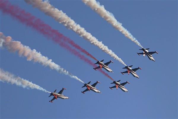 Türk Yıldızları’nın usta pilotlarının uçaklarla gerçekleştirdiği heyecan dolu gösteri, akrobasi timinde yer alan bir pilotun uçak içerisinden Antalyalıların bayramını kutlamasıyla başladı. Pilotun uçak içinden sesini duyan Antalyalılar bu kutlamaya alkışlarıyla karşılık verdi. Usta pilotların uçaklarla gerçekleştirdiği ters dönüşler ve manevralar ilgiyle izlendi. Türk Yıldızları, gökyüzüne uçaktan çıkan kırmızı dumanla kalp çizdi.
