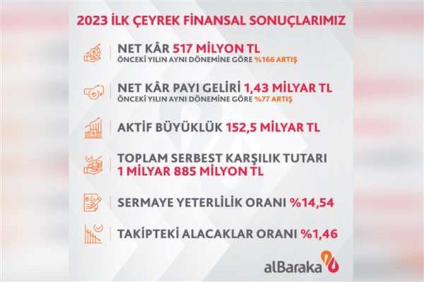 Türkiye’nin ilk katılım bankası Albaraka Türk, 2023 yılının ilk çeyreğinde solo bazda 517 milyon TL net kar elde ederek, önceki yılın aynı dönemine göre net karını yüzde 166 artırdı.