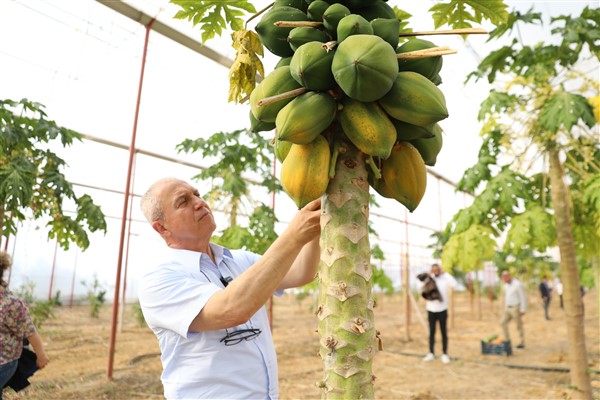 Alanya Belediye Başkanı Osman Tarık Özçelik, serada yetiştirilen ve hasat vermeye başlayan tropikal meyve ağaçlarını inceledi.Özellikle papaya, mango ve ejder meyvesi gibi egzotik türlerin başarılı bir şekilde üretildiğini inceleyen Başkan Özçelik, papaya ağaçlarından toplanan meyveleri tadarak, yanında bulunan ekibe de ikram etti.