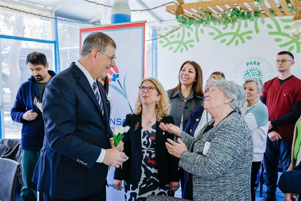 Parkinson Hasta ve Yakınları Derneği Başkanı Gülnur Kelçe de Başkan Tugay'a parkinson hastalığının sembolü haline gelen Parkinson Lalesi takdim etti.