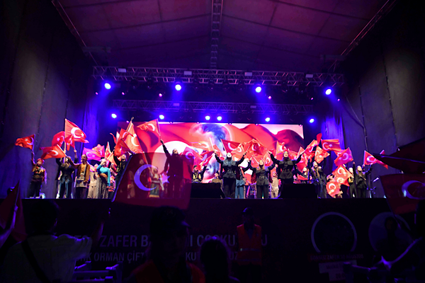 Müzikalin ardından sahneye çıkan sanatçı Canozan, şarkılarıyla izleyicilere performans sergiledi. Katılımcılar ellerinde Türk bayraklarıyla alanı kırmızı beyaza bürüdü.