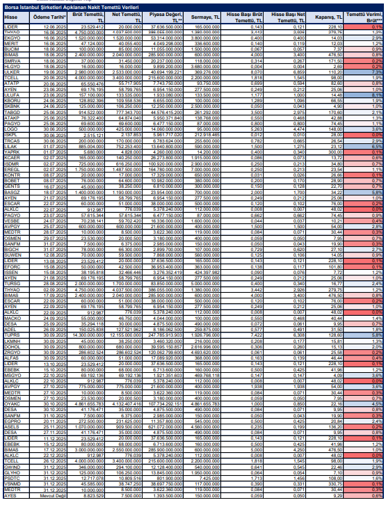 2024 yılı karından temettü dağıtımına dair Yönetim Kurulu kararı almış BİST şirketlerinin dağıtmayı planladığı nakit temettü tutarı, temettü dağıtım tarihi ve temettü verimleri şu şekilde: