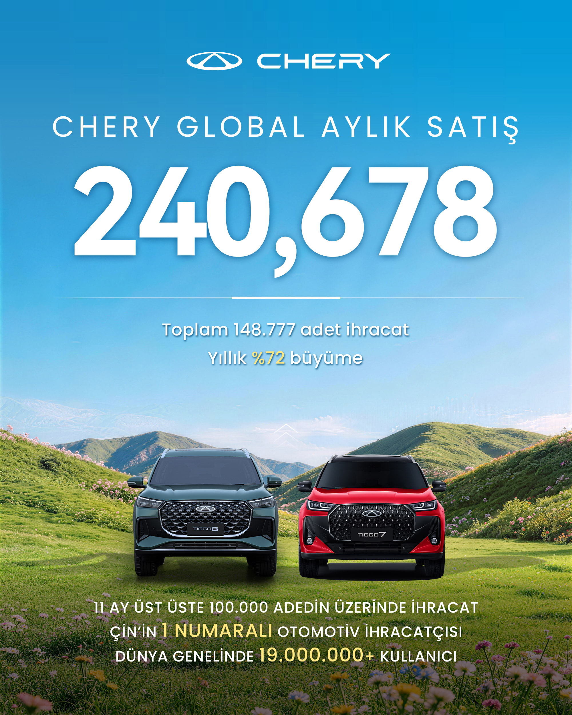 Ürün geliştirmeden satış sonrası deneyime kadar her aşamada kullanıcı odaklı yaklaşımını sürdüren Chery, güçlü ihracat performansı ve artan küresel bilinirliğiyle Çin otomotiv endüstrisinin dünya sahnesindeki önemli temsilcilerinden biri olmayı sürdürüyor. Önümüzdeki dönemde Chery, istikrarlı ve sürdürülebilir büyüme stratejisi doğrultusunda küresel varlığını daha da genişleterek dünya genelindeki kullanıcılarına daha güvenilir ve tatmin edici mobilite deneyimleri sunmaya devam edecek.