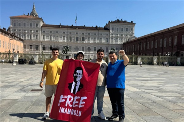 Eylem sırasında Öztürk ve oğulları, Türkçe ve İtalyanca olarak “Halkın umudu İmamoğlu” sloganları attı.
