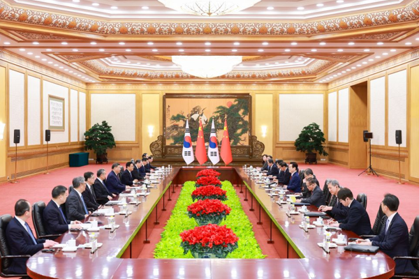 Çin Cumhurbaşkanı Xi Jinping bugün başkent Beijing’deki Büyük Halk Toplantı Sarayı’nda, Çin’e resmi ziyarette bulunan Kore Cumhuriyeti (KC, Güney Kore) Cumhurbaşkanı Lee Jae-myung ile bir araya geldi.