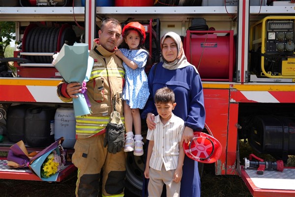 Tatbikat yapan itfaiye personeline Basın Yayın ve Halkla İlişkiler Müdürlüğü tarafından hazırlanan sürprizle, babalar çocuklarıyla buluşturuldu.