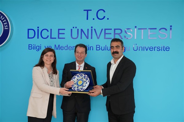 Diyarbakır Büyükşehir Belediyesi Eş Başkanları Bucak ve Hatun ile Genel Sekreter Emrullah Gördük, Dicle Üniversitesi Rektörü Prof. Dr. Kamuran Eronat'ı ziyaret etti.