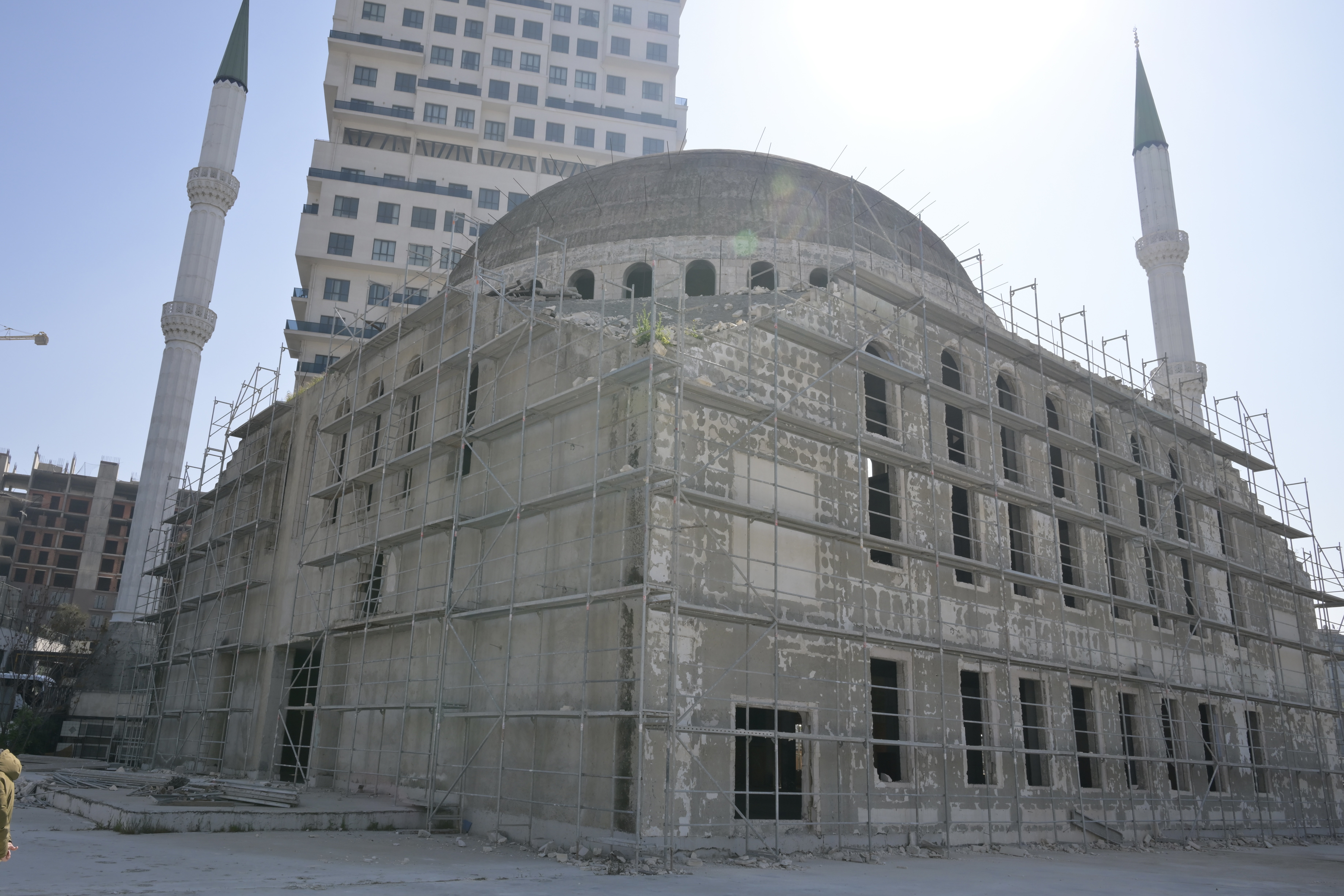 21 Haziran itibarıyla dış cephe çalışmaları tamamlanacak İlçe Müftüsü Selami Aykul ile birlikte inşaat sahasında incelemelerde bulunan Aksoy, caminin dış kaplamasında kullanılacak taşı birlikte seçtiklerini ve dış cephe çalışmalarının 21 Haziran’a kadar tamamlanacağını belirtti.