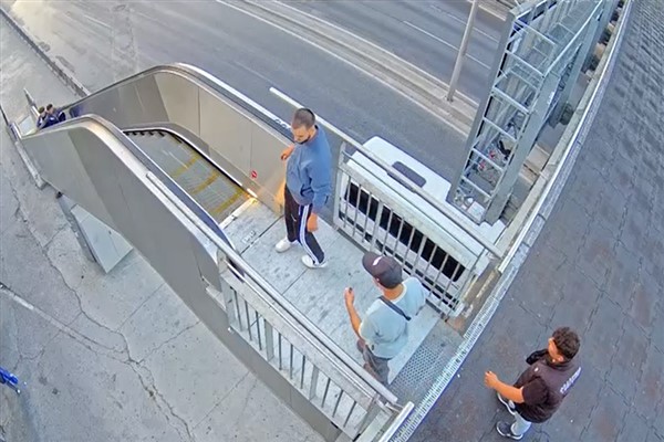 "İstanbulluların, ulaşım hakkına, huzuruna yönelik sabotajlar sürüyor. İBB, yürüyen merdivenleri kasıtlı olarak durduranlara yönelik suç duyurusunda bulunmaya devam ediyor. Yürüyen merdivenleri kasıtlı olarak durduran, müdahalelerle bozan kişilerin suç ifşalarının yer aldığı güvenlik kamera görüntülerine yenileri ekleniyor. Yer, Beylikdüzü Metrobüs Durağı. Tarih 17 Eylül 2023. Saat 07.01.Çalışır haldeki yürüyen merdiven kasıtlı olarak durduruluyor."