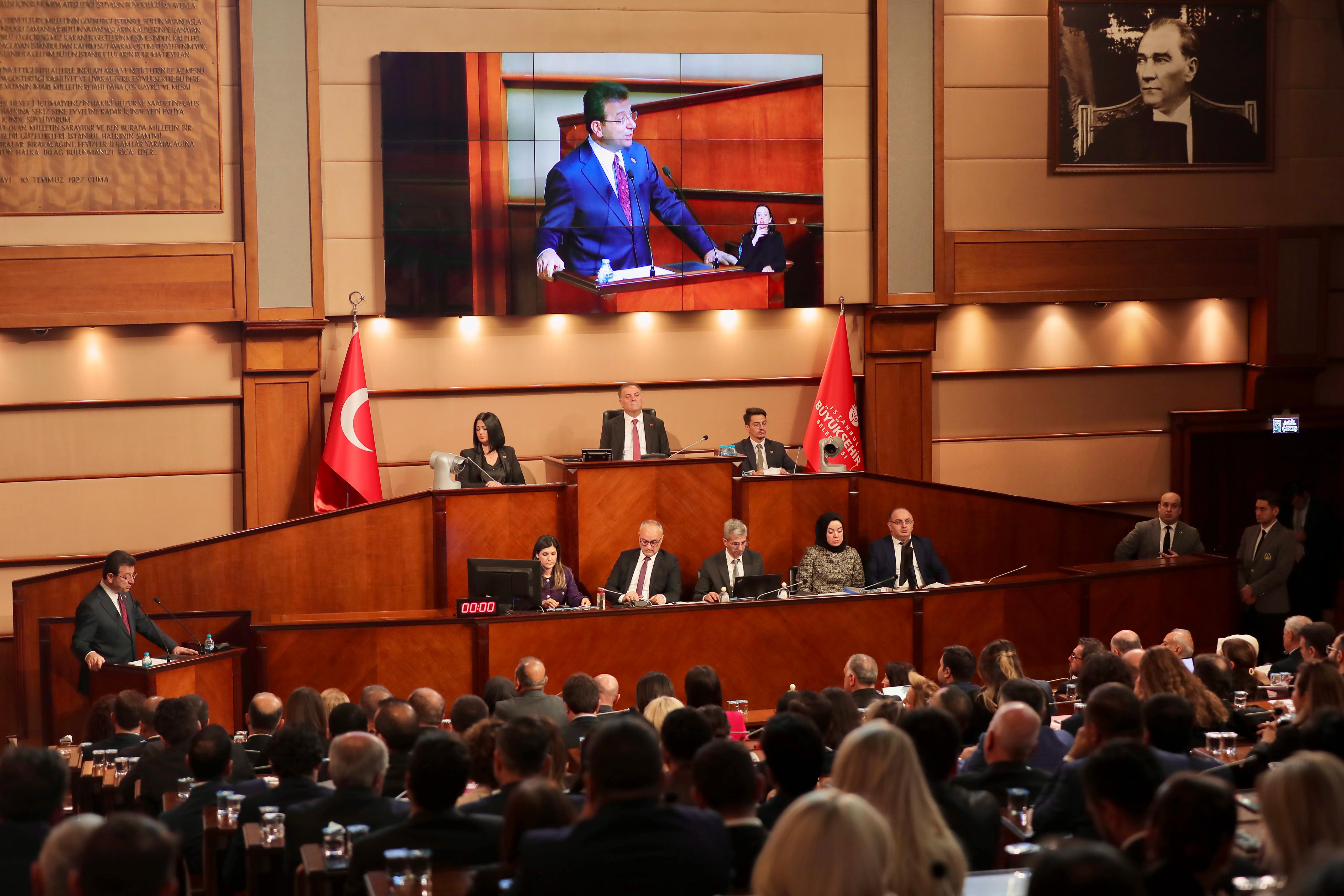 Sözlerine, “Burada grubu bulunan bütün partilerin, İstanbul halkı tarafından seçilmiş İBB Meclis üyelerine ve bütün belediye başkanlarına, aramızda olmayan Ahmet Özer dahil sevgiyle, saygıyla selamlıyorum” şeklinde başlayan İmamoğlu, özetle şunları söyledi: