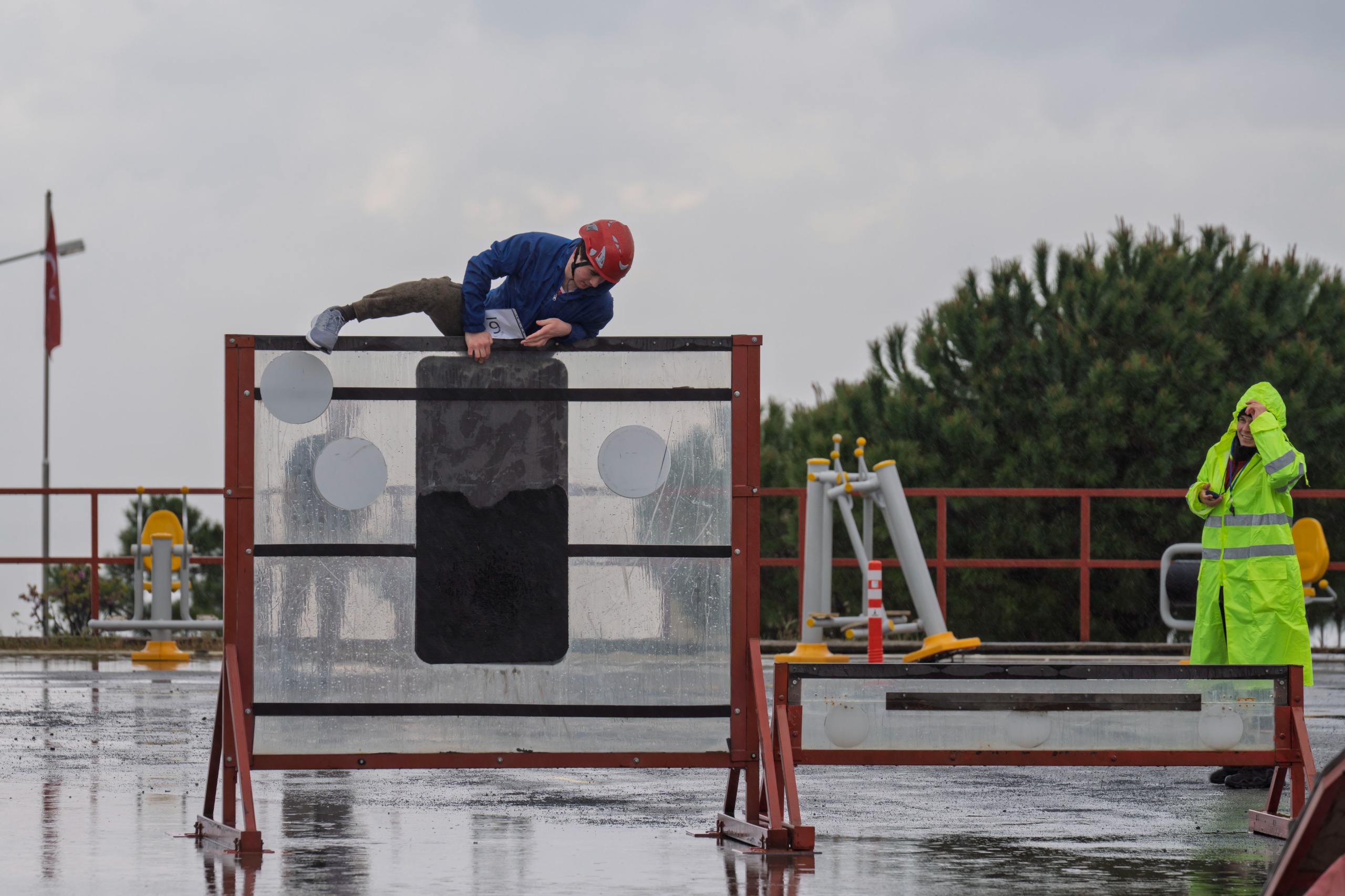 Uygulama sınavının ilk gününde yağışlı havada mücadele veren adaylar, İzmir İtfaiyesi bünyesinde görev yapmak için yarıştı. İtfaiyeci adayları, zorlu yarışa engel tahtasını (zabor) aşarak başladı. Daha sonra uzunluğu 12 metre, genişliği 18 santimetreyi bulan denge tahtasında yürüyerek tünelden geçti. Fiziki yeterliliğin ölçülmesi için 33 metre koşunun ardından kurulu olan merdivenden kuleye tırmanarak en zorlu parkurları test eden adaylar, karanlık ve dumanlı odada yön bulmaya çalıştı, itfaiye araçlarının direksiyonuna geçti.