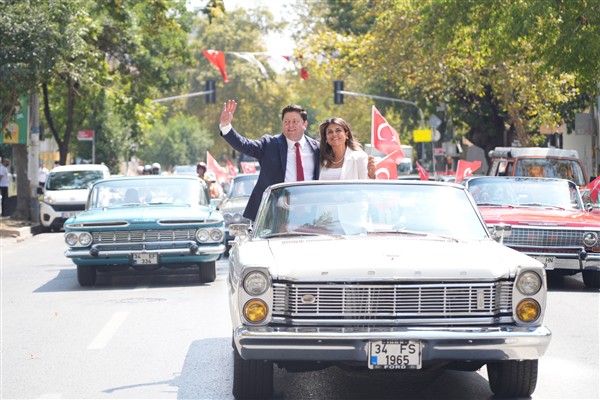 Bayraklarla süslenen klasik otomobiller caddeden geçerken Kadıköylüler de balkonlardan ve kaldırımlardan ellerinde bayraklarıyla konvoyu selamladı.