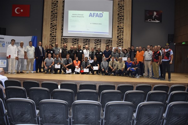 Programın temel amacı, afet farkındalığını artırmak, risklere karşı hazırlıklı olmayı teşvik etmek ve halkın bilinçli hareket etmesini sağlamak oldu. Bu kapsamda, KUMDAK Doğa Timi’ne yeni katılan gönüllülere sertifikaları takdim edilirken, eğitime katkı sağlayan kişi ve kurumlara teşekkür plaketi sunuldu. Etkinliğe Karacabey Belediye Başkan Vekili İsmail Can, Belediye Başkan Yardımcısı Bora Akın, AFAD İl Müdürü Mehmet Buldan, KUMDAK Başkanı Saim Bayram, siyasiler, sivil toplum kuruluşlarının temsilcileri, belediye personeli ve vatandaş katıldı.