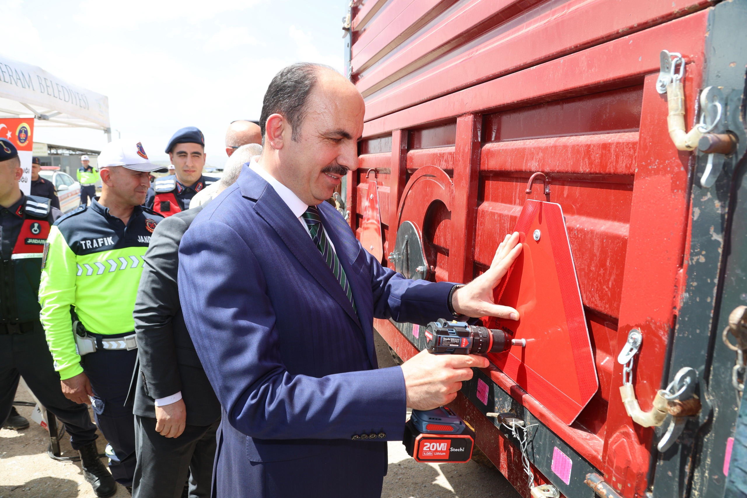 Konya Valisi İbrahim Akın, Konya İl Jandarma Komutanı Tümgeneral Lütfi Özkul ve Konya Büyükşehir Belediye Başkanı Uğur İbrahim Altay, Trafik ve İlkyardım Haftası’nda "Reflektör tak, görünür ol” projesi kapsamında Meram Hatunsaray Mahallesi’nde traktörlere reflektör dağıtım programına katıldı.