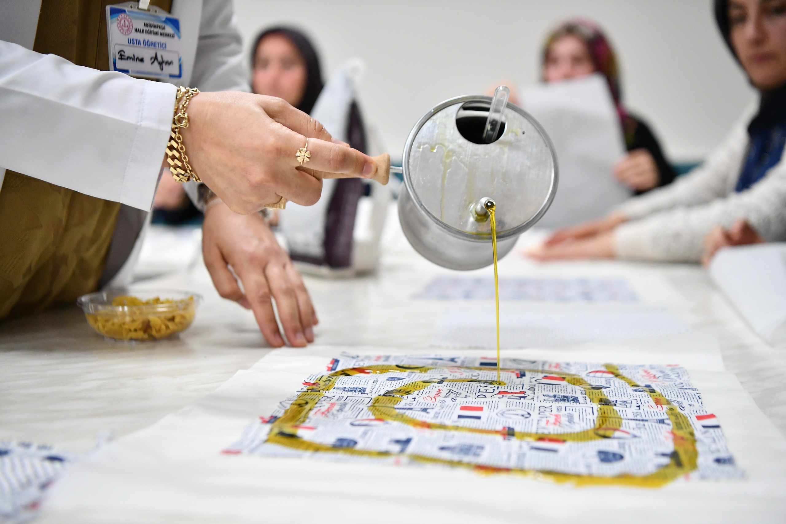 Mamak Belediyesi Kutludüğün Bilim ve Sanat Merkezi Aile Merkezi’nde kursiyerlere yönelik balmumlu kumaş üretimi atölye çalışması gerçekleştirildi.