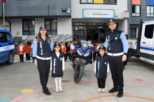 Osmangazi Belediyesi Zabıta Müdürlüğü ekipleri tarafından Orhan Kara İlkokulu’nda gerçekleşen eğitimde, öğrencilere zabıta kıyafeti giydirilerek zabıta biriminin günlük çalışma akışı uygulamalı bir şekilde öğretildi. Bunun yanı sıra çocuklar, zabıta ekiplerinin şehir düzenini sağlamak adına üstlendiği sorumluluklar hakkında bilgilendirildi. Program kapsamında toplumsal kurallar, kaldırım kullanımının önemi, iş yerlerinde etiket kontrolü ve çevre temizliği gibi konular da çocukların anlayabileceği sade bir dille işlendi.