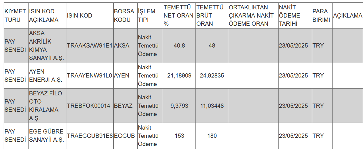 Kamuyu Aydınlatma Platformuna (KAP) yapılan açıklamaya göre, Merkezi Kaydi Sistemde gerçekleştirilen hak kullanım ödemelerine ait kayıtlar şöyle: