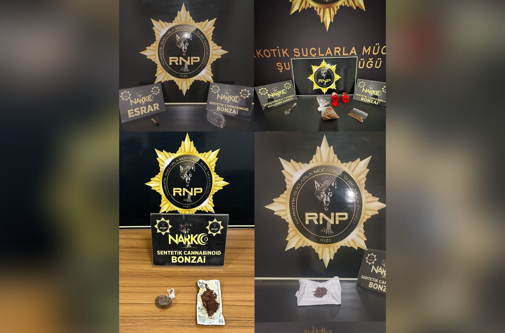 Rize Emniyet Müdürlüğü tarafından 23.06.2025 – 08.07.2025 tarihleri arasında Rize genelinde uyuşturucu ve uyarıcı madde ticareti yapan ve Rize'ye uyuşturucu ve uyarıcı madde getireceği değerlendirilen şahıs ve gruplara yönelik yürütülen çalışmalarda tespit edilen şahısların yapılan ikamet, üst ve araç aramalarında 143,68 gram sentetik cannobinoid (bonzai) maddesi, 5,47 gram sentetik cannobinoid (bonzai) hammaddesi (yaklaşık 500 gram bonzai üretilebilen madde), 2,42 gram metamfetamin maddesi, 0,63 gram esrar maddesi, 2 adet sentetik ecza hapı, 1 adet uyuşturucu kullanım aparatı ele geçirildi.