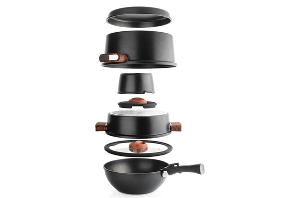 İç içe geçebilme özelliği sayesinde fonksiyonel bir kullanım sağlayan ve yer kaplamayan setin içerisinde, krep tavası, derin tencere, sos tenceresi ve kapağı, sığ tencere, büyük kapak (sığ tencere, wok ve derin tencereye uyumlu), wok ve ayrılabilir kulp bulunuyor.
