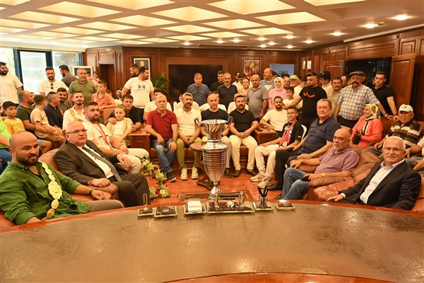 Konvoyun ardından Kumluca Belediyesi önünde pehlivanlar için karşılama töreni yapıldı.