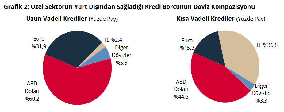 157,8 milyar dolar tutarındaki uzun vadeli kredi borcunun yüzde 60,2'sinin ABD doları, yüzde 31,9’unun Euro, yüzde 2,4’ünün Türk lirası ve yüzde 5,5’inin ise diğer döviz cinslerinden oluştuğu; 15,5 milyar ABD doları tutarındaki kısa vadeli kredi borcunun ise yüzde 44,6’sının ABD doları, yüzde 15,3’ünün Euro, yüzde 36,8’inin Türk lirası ve yüzde 3,3’ünün ise diğer döviz cinslerinden oluştuğu görülüyor.