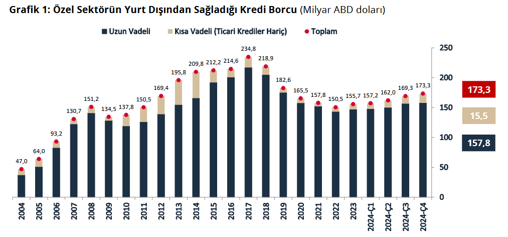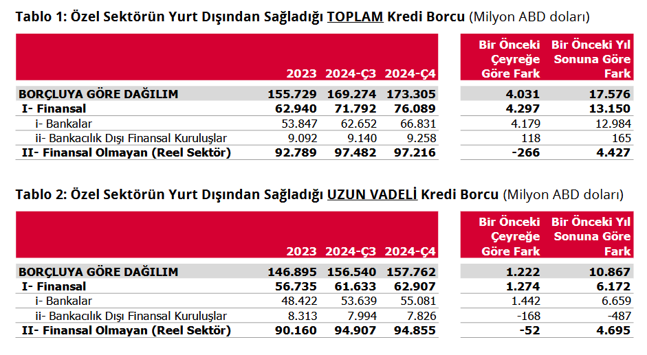 Türkiye Cumhuriyeti Merkez Bankası (TCMB) verilerine göre, özel sektörün yurtdışından sağladığı uzun ve kısa vadeli kredi borcu stokunda 2002’ye kadar güncellemeler gerçekleştirildi. Aralık sonu itibarıyla, özel sektörün yurt dışından sağladığı toplam kredi borcu, bir önceki çeyreğe göre 4,0 milyar dolar artarak 173,3 milyar dolara yükseldi.