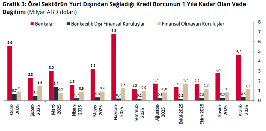 Aralık sonuna göre özel sektörün yurt dışından sağladığı toplam kredi borcunun 1 yıla kadar olan vade dağılımı incelendiğinde, toplam borç tutarının 53,4 milyar dolar olduğun görüldü