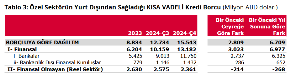 Aynı dönemde, finansal kuruluşların uzun vadeli borçları 1,3 milyar dolar artarken finansal olmayan kuruluşların uzun vadeli borçları 52 milyon dolar azaldı. Kısa vadede ise finansal kuruluşların borçlarının 3,0 milyar dolar artış, finansal olmayan kuruluşların borçlarının ise 214 milyon dolar azaldı.
