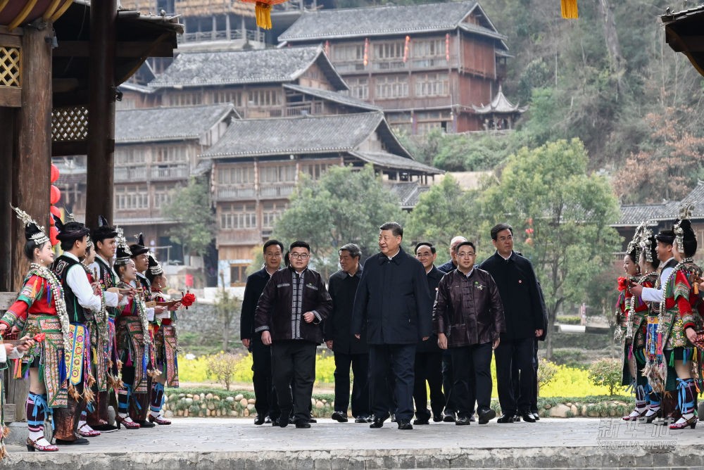 Xi, ilçedeki Zhaoxing Dong Köyü'ndeki, Dong etnik grubuna özgü ve kendine has mimarisiyle dikkat çeken davul kulesinde, yerel halkla bir araya gelerek kapsamlı kırsal kalkınma üzerine sohbet etti.