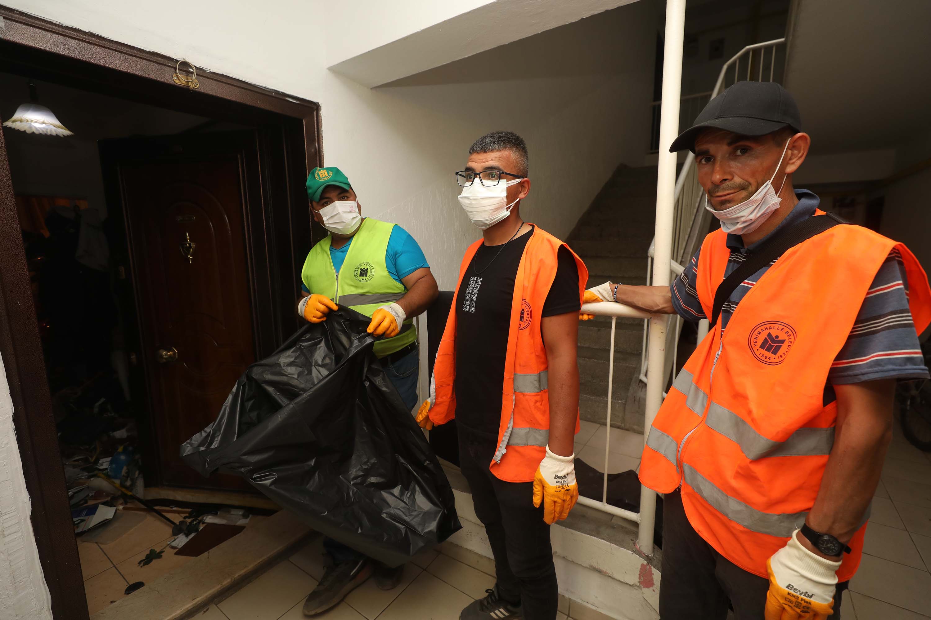 Evin tüm odalarının çöp yığınları ile dolduran vatandaşın, kullanılamayacak duruma gelmiş eşyaları, hurda yığınları ve atıklar ekipler tarafından tahliye edildi.